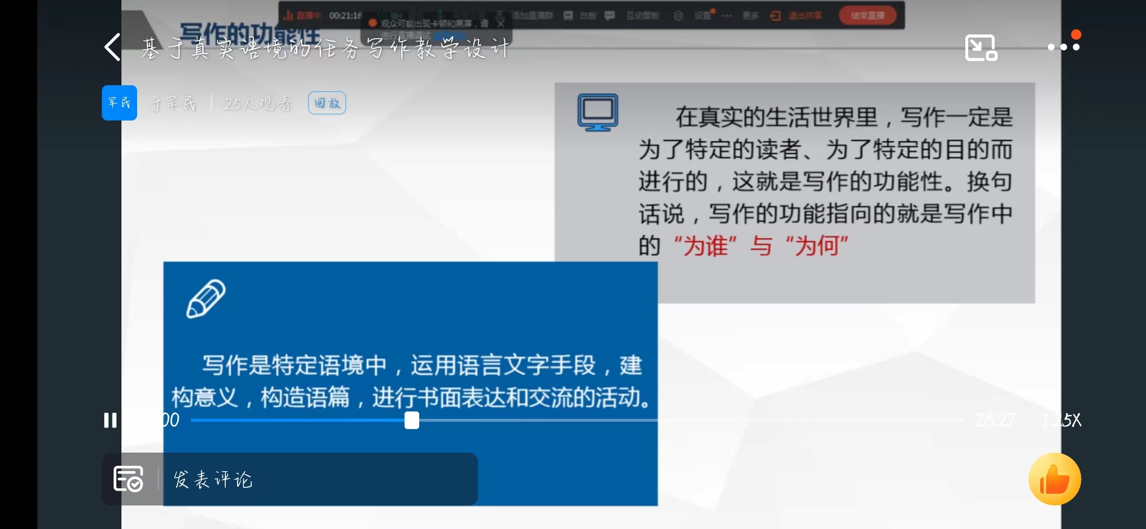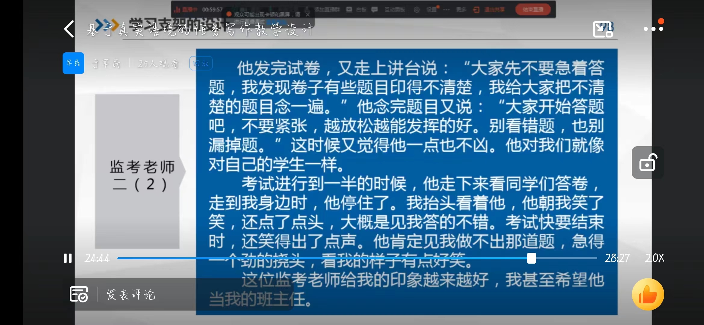 第一场直播授课,于军民老师就“整本书阅读教学”围绕五个方面展开。一是课程改革注重整本书阅读,体现整本书阅读的地位和价值;二是读法—整本书阅读的重要教学内容,从阅读层面和分类展开叙述;三是指向阅读学习的主要教学路径,指出教师精讲读法要点再范例操作,让员工自主阅读,然后阅读结果反馈,最后达到举一反三的能力;四是阅读任务单刺激,制定目标和任务,引导员工挖掘阅读趣味性,形成内在阅读动力;五是整本书阅读教学情讲,通过互动、阅读心得分享、评价的方式、活跃的氛围激发阅读兴趣,挖掘文本价值。第二场直播授课中于军民老师对“真实语境”和“任务型写作”做出阐释,指出写作需要真实的写作情境并以高考作文举例,从任务设计、学习元素和学习支架三个方面进行写作教学。员工在写作过程中需要写作知识、技能、策略和态度,更需要学习支架的帮助和支持。同时展示了任务型写作教学设计的基本思路,即“为何写”、“学什么”、“写什么”、“怎么写”、“怎么评”,通过示例引导员工写作教学。