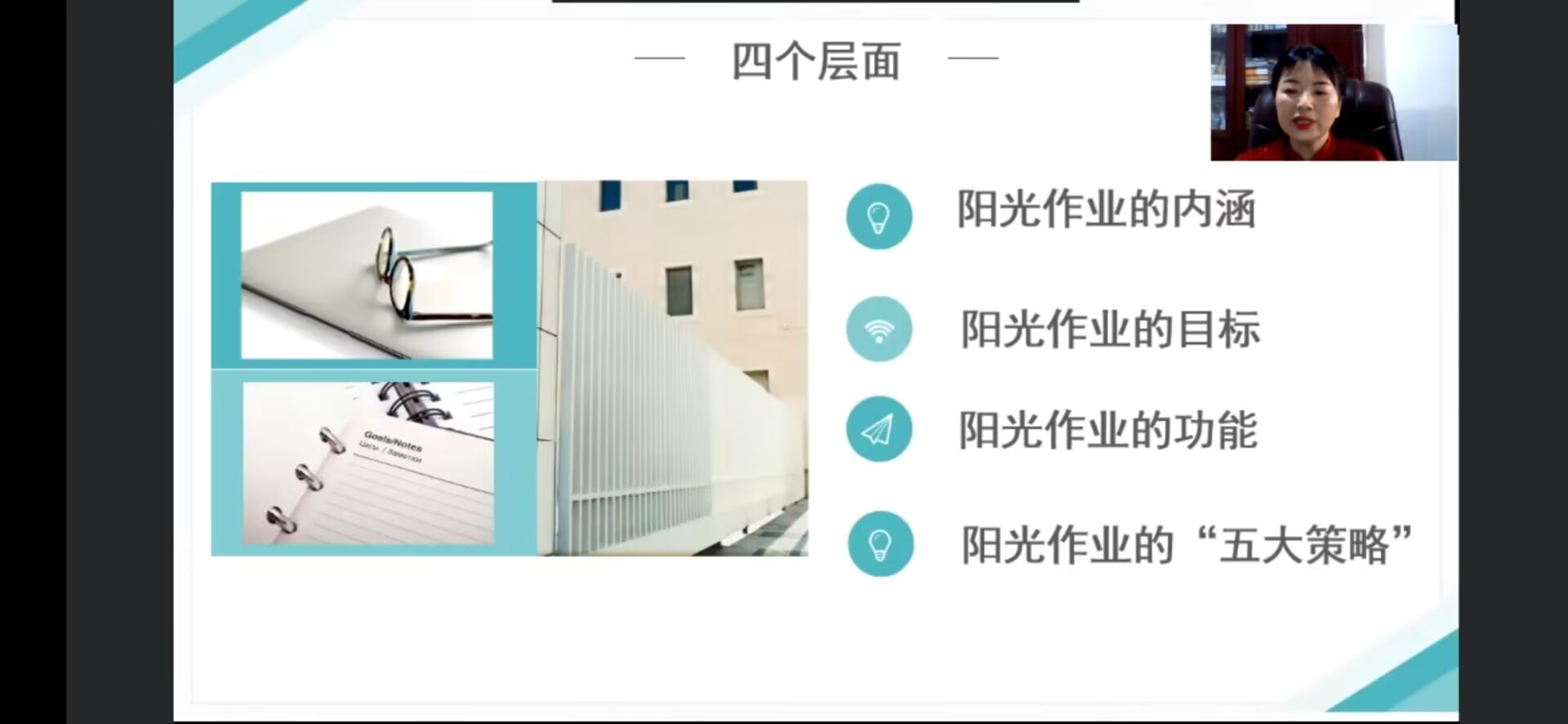 刘老师在讲座中首先提出了小员工的作业主要存在着“五多五少”的问题,员工难免望‘业’生问。2021年7月,中共中央、国务院下发《双减文件》,引领教育工作者着眼于“减负、提质、增效”,为使得作业触及小员工生活,刘老师提出“阳光作业”的新路径,主要从四维度:内涵、目标、功能、“五大策略”分别展开。阳光作业,力求解决作业的单一化、低效化、一元化,让孩子在享受中获得知识性的积累,实现课堂高效化。其功能主要为巩固新知、发展能力、反馈信息、沟通情感。为使阳光作业高效实施,优化作业类型、优化“三评价,两开放,三监督”的管理机制,优化课堂练习与作业设计、创新作业评价路径、创新作业管理方式的五大策略必不可少。实施阳光作业,可以实现员工阳光的人生,为更好提高员工整体素养,还要做到“五抓不放松”,即抓习惯、阅读、自律、家务、兴趣,将学习与生活结合起来才能为其人生添一抹亮色。刘老师提到,教育不是为了成绩服务的,而是为了孩子本身服务的,落实双减,时不待人,只要老师们转理念、优课堂、精作业、创课程、改评价、强服务,在作业设计上关注单元主题、语文要素、人文素养,注意整合,顺势而为,就能走好时代的新征程。