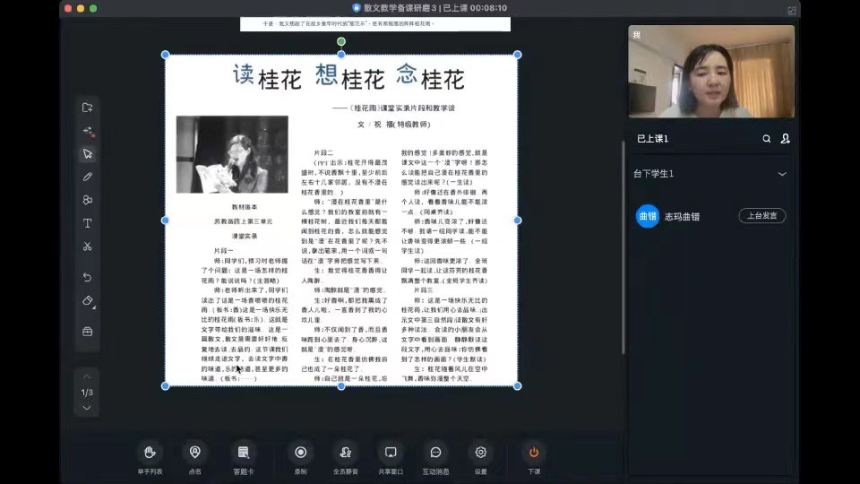 2022年7月8日,tyc5997太阳集团米禧老师在钉钉会议石渠县“1+1+10”国培群进行6个学时的散文教学备课研磨活动。课堂从理论以及具体的三个课例(分别是《童年的馒头》、《生命,生命》、《桂花雨》)来为师范生讲解如何进行散文教学备课。