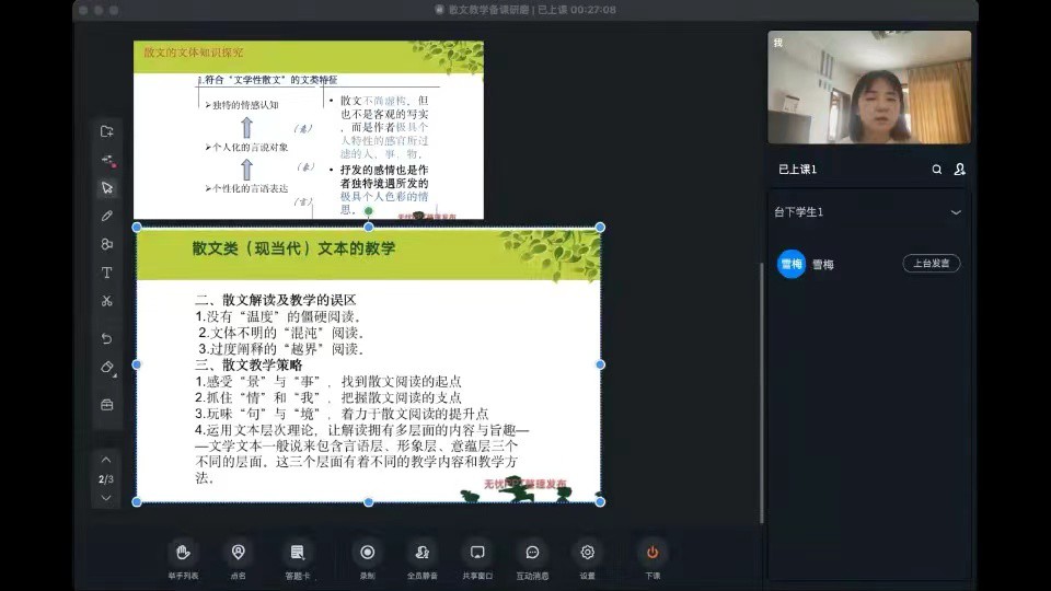 最后,米禧老师总结此次课的内容,强调教学首先关注作者独具个性的语言,其次是要感受作者所描绘的景色,最后关注表现的情感和主题。她希望通过此次直播课,能够给国培学员们散文教学一些启示。