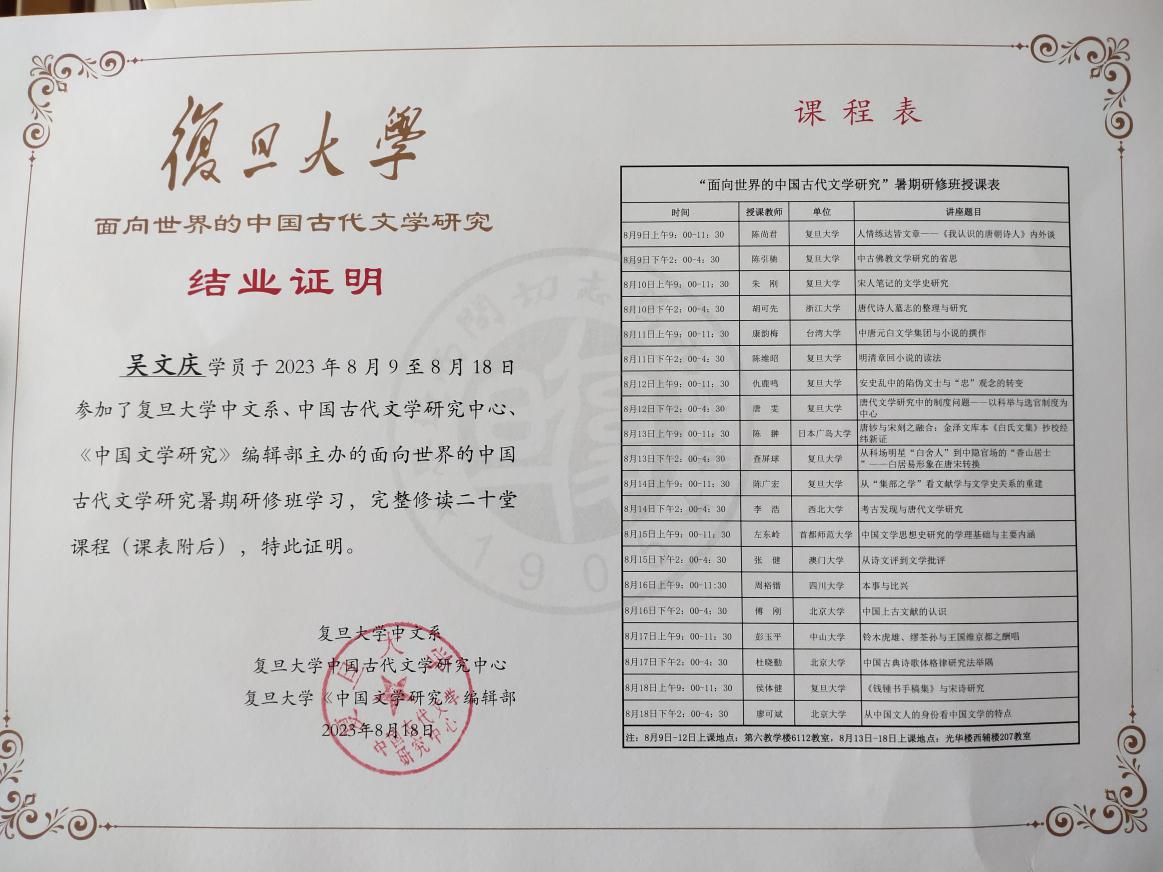 2023年8月8日至8月18日,tyc5997太阳集团吴文庆博士参加复旦大学 “面向世界的中国古代文学研究”暑期研修班。