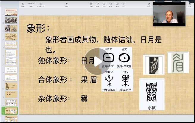 许慎在《说文解字》中将造字法分为“象形、指事、会意、形声、转注、假借”等六大类。古家臻讲师重点分析了造字法中的“象形”,形象生动的展示了古人在造字时善于观察事物的形体特征和视觉角度,看见的看不见的都很重要。继而总结出对规律的把握是造字的精髓所在。