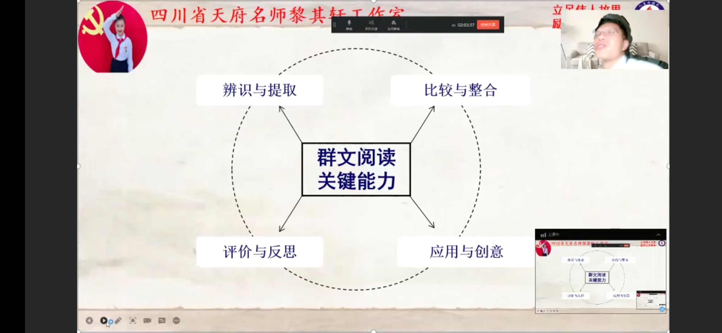 2022年6月16日晚来自廖梁国鼎兴名师工作室的广安市邻水县鼎屏镇第三小学高级教师黎其轩老师在石渠县小学语文骨干教师“1+1+10”学习项目培训课程中开展以“群文思维助力名师成长”为主题的讲座。
